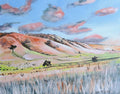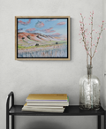 "Finders Ranges Sunset" by Jen Biscoe is a stunning oil painting that captures the beauty a sunset glowing off the Flinders Ranges in South Australia. Completed on a stretched canvas with hanging wire attached, or ready to frame.