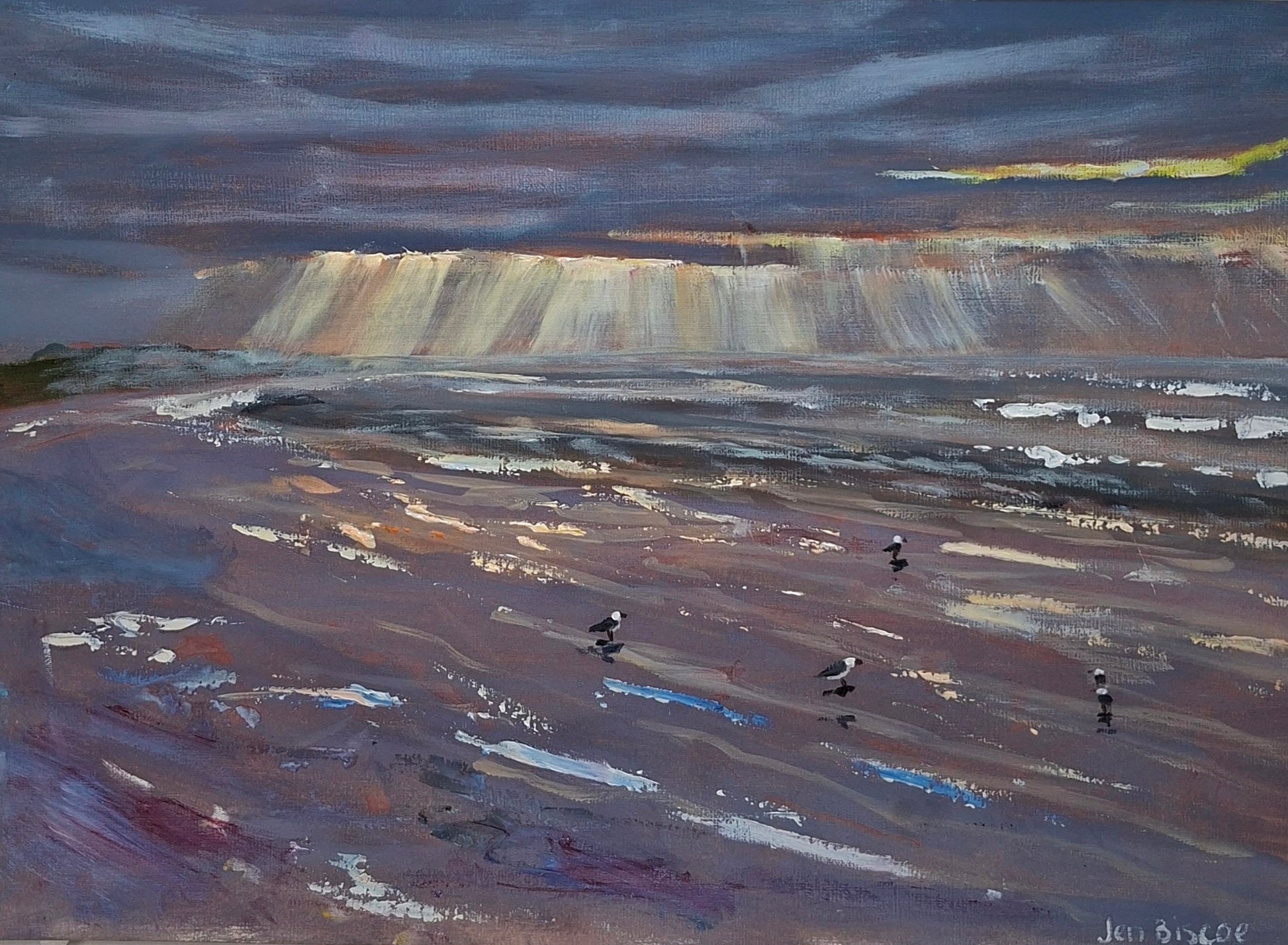 Seagull Sunrise Goolwa is an original artwork on A3 paper that captures the magic of dawn breaking over this South Australian beach. Sunlight pierces through the clouds, illuminating the sand and ocean. Seagulls dot the shoreline, adding life and movement to the scene. The work celebrates that quiet moment when day begins.